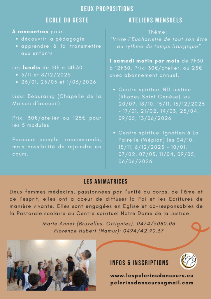 Ateliers mensuels explorant par le geste habité, le mouvement doux et la danse, les grandes prières liturgiques ainsi que l’actualisation de la Parole, afin de vivre avec une plus grande conscience la présence à la Présence.